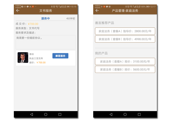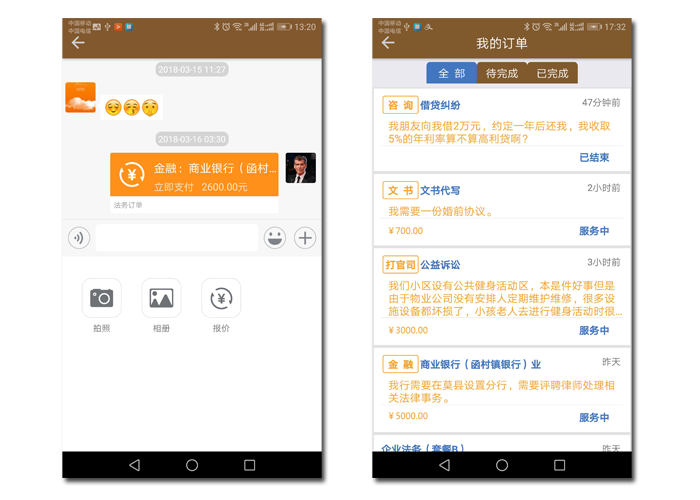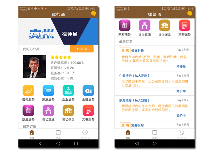 昂莱律师通APP为律师提供了接收和管理,客户从昂莱法务通APP提交的法律服务订单和法律咨询的功能。为了便于律师跟进管理各类法律服务订单,按订单类型划分了咨询服务、家庭法务、企业法务、金融法务、政府法务、诉讼直通、诉讼保全、文书服务等,八个订单管理模块。此外还提供了实时接收最新订单信息的最新订单版块,以及功能强大的消息管理模块。而在个人中心还为律师提供了:个人资料、名片、钱包、设置、我的订单、我的评价、资格认证、推荐有礼、礼券包、关于善言、协议申明、帮助中心、意见反馈等功能模块,务求实现提高律师工作效率,助力律师开拓新业务、发掘新客户的共赢目标。
